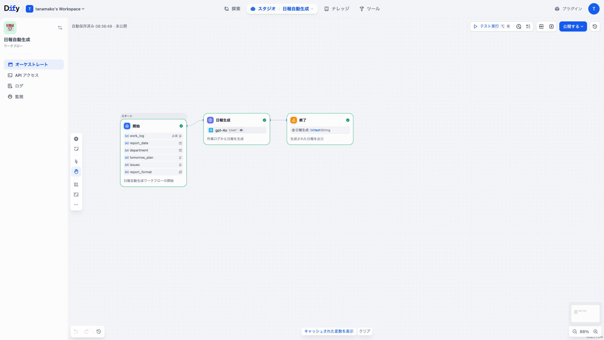Difyで構築した日報自動生成ワークフローです。作業メモやGit履歴、タスク管理ツールのデータから日報を自動生成。シンプル/詳細/KPT形式など複数フォーマットに対応し、日報作成時間を80%削減。毎日15分の作業が3分に短縮されます。