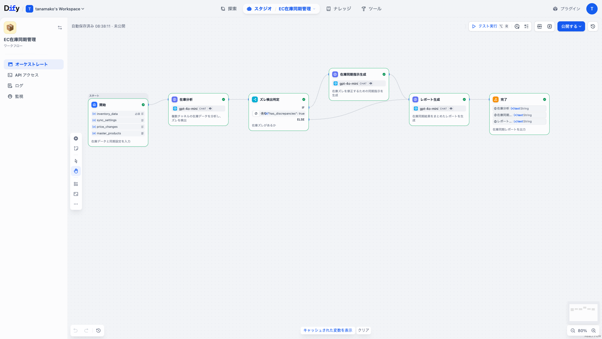 Difyで構築したEC在庫同期管理ワークフローです。自社EC、楽天市場、Amazon、Yahoo!ショッピングなど複数チャネルの在庫データを分析し、在庫ズレを自動検出。マスタ在庫を基準に各チャネルを自動同期し、価格改定も反映します。在庫管理時間を70%削減し、在庫ズレによる機会損失を防止します。