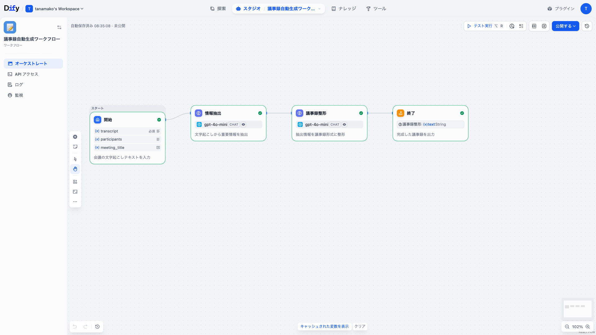 Difyで構築した議事録自動生成ワークフローです。会議の録音や文字起こしテキストを入力するだけで、参加者の発言を整理し、決定事項・アクションアイテムを自動抽出。マークダウン形式の議事録を生成します。議事録作成時間を80%削減し、会議後すぐにチーム共有が可能になります。